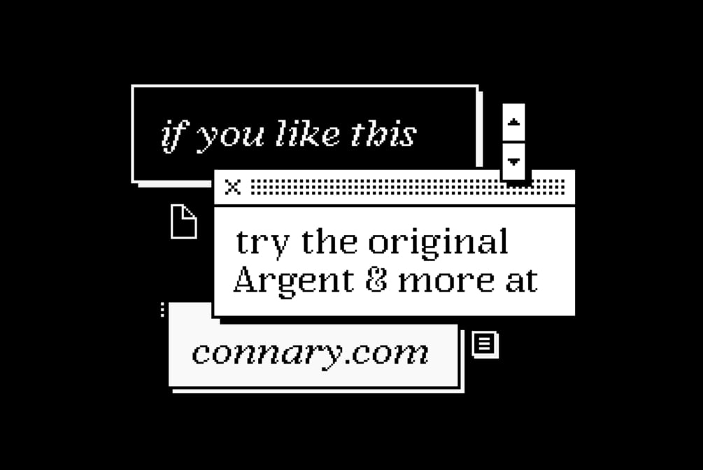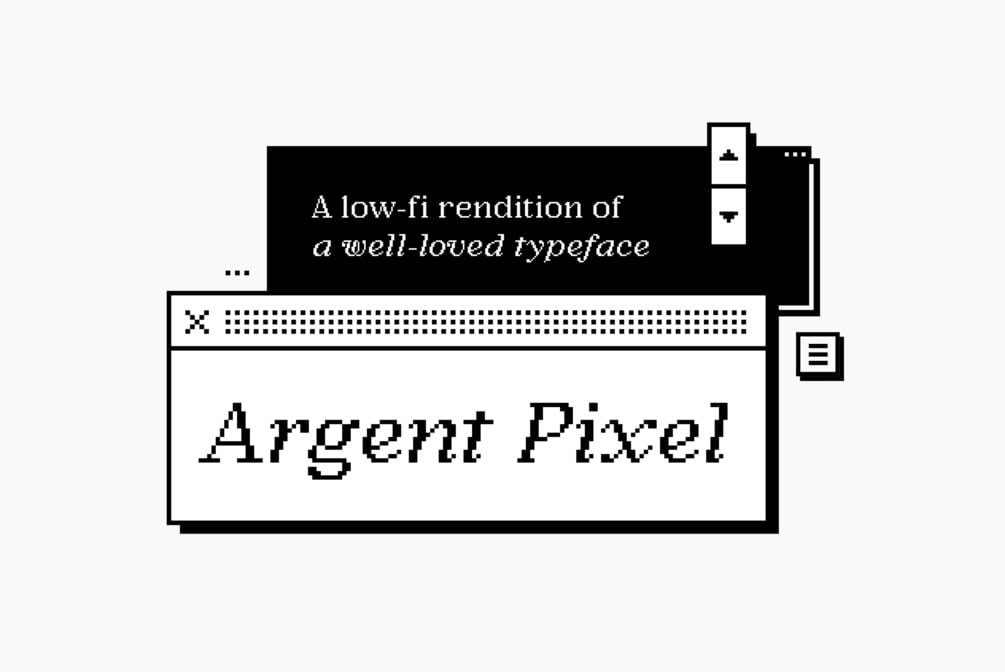 Argent Pixel CF is a low resolution, pixel-based version of the original Argent typeface. Argent Pixel recreates the distinctive look and feel of Argent in an intentionally limited form – evocative of early Macintosh typography, but compatible with modern systems.